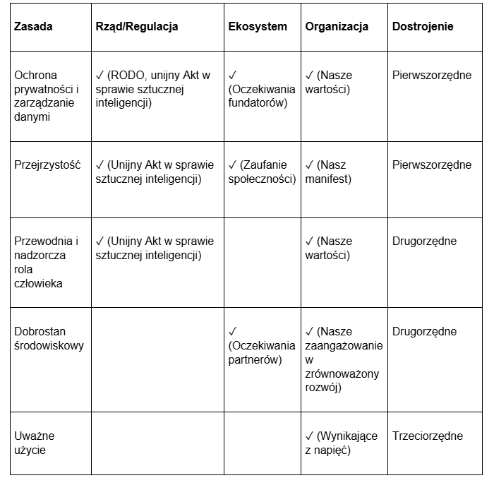 Rozmowa na temat napięć jest tutaj szczególnie cenna. Wyrażenie przez twój zespół dużych obaw związanych z autentycznością, wskazuje na takie zasady jak "Człowiek w centrum". Jeżeli w rejestrze powtarzają się odniesienia do ochrony prywatności danych, oznacza to, że pierwszorzędne znaczenie ma "Ochrona prywatności i zarządzanie danymi".