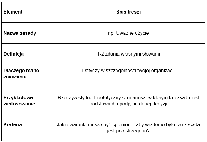 Zidentyfikowanie zasad to tylko połowa pracy. Takie takie jak "sprawiedliwość" czy "przejrzystość" oznaczają różne rzeczy dla różnych organizacji. Twoim zadaniem jest zdefiniowanie, co każda zasada oznacza w twoim kontekście.